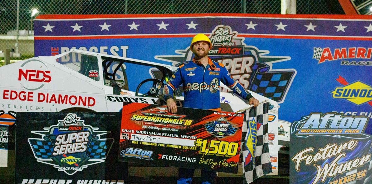 Tyler Peet drove from the 10th row to win Friday night’s Bob Hilbert Sportswear Short Track Super Series (STSS) Fueled By Sunoco Sportsman 25-lap event to kick off the 16th annual Short Track SuperNationals at Afton Motorsports Park.